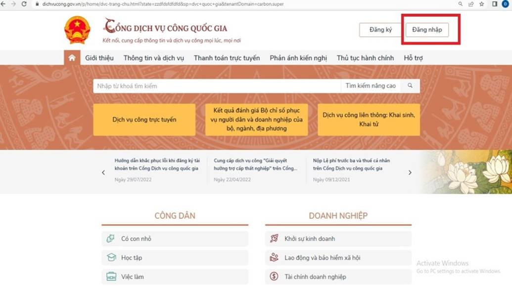 * Bước 1: Truy cập vào Cổng Dịch vụ công Quốc gia theo đường dẫn sau: https://dichvucong.gov.vn/p/home/dvc-trang-chu.html