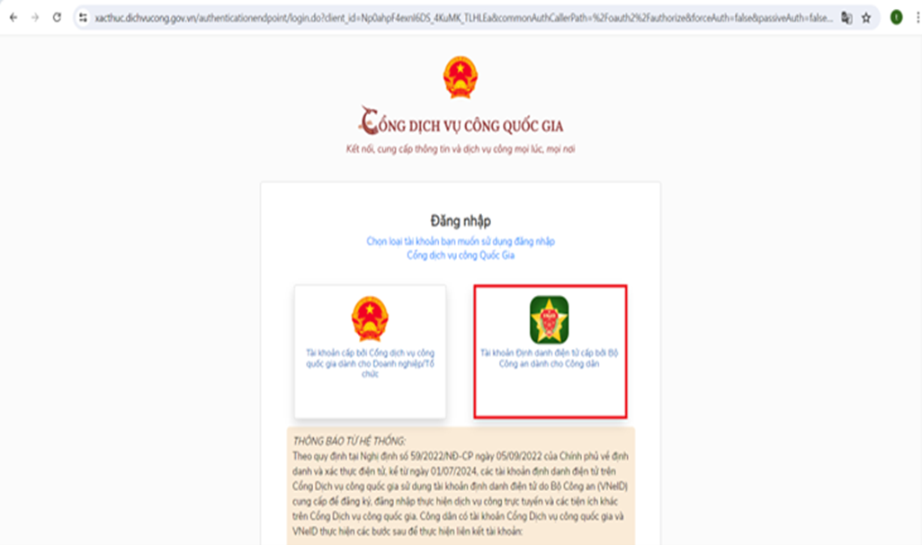 - Nhấn vào ô “Đăng nhập” và chọn phương thức đăng nhập bằng “tài khoản định danh điện tử cấp bởi Bộ Công an dành cho Công dân”.