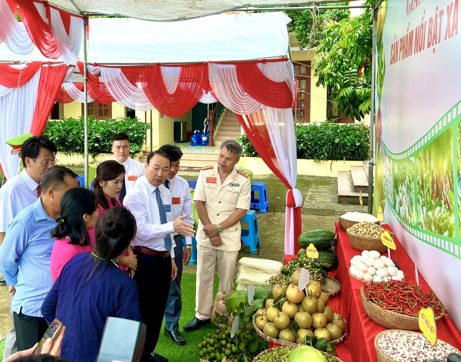 (Trong thời gian giải lao Đồng chí Nguyễn Công Trưởng đã cùng đoàn Đại biểu của xã đi tham quan gian trưng bày sản phẩm của địa phương, và đóng góp các ý kiến giúp cho mô hình nông lâm sản của xã phát triển mạnh hơn nữa)