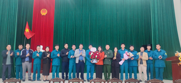 Đ/c Hoàng Hải Yến - Phó Bí thư Thường trực Đảng ủy xã, tặng hoa chúc mừng BCH Quân sự và Tiểu đội dân quân thường trực xã