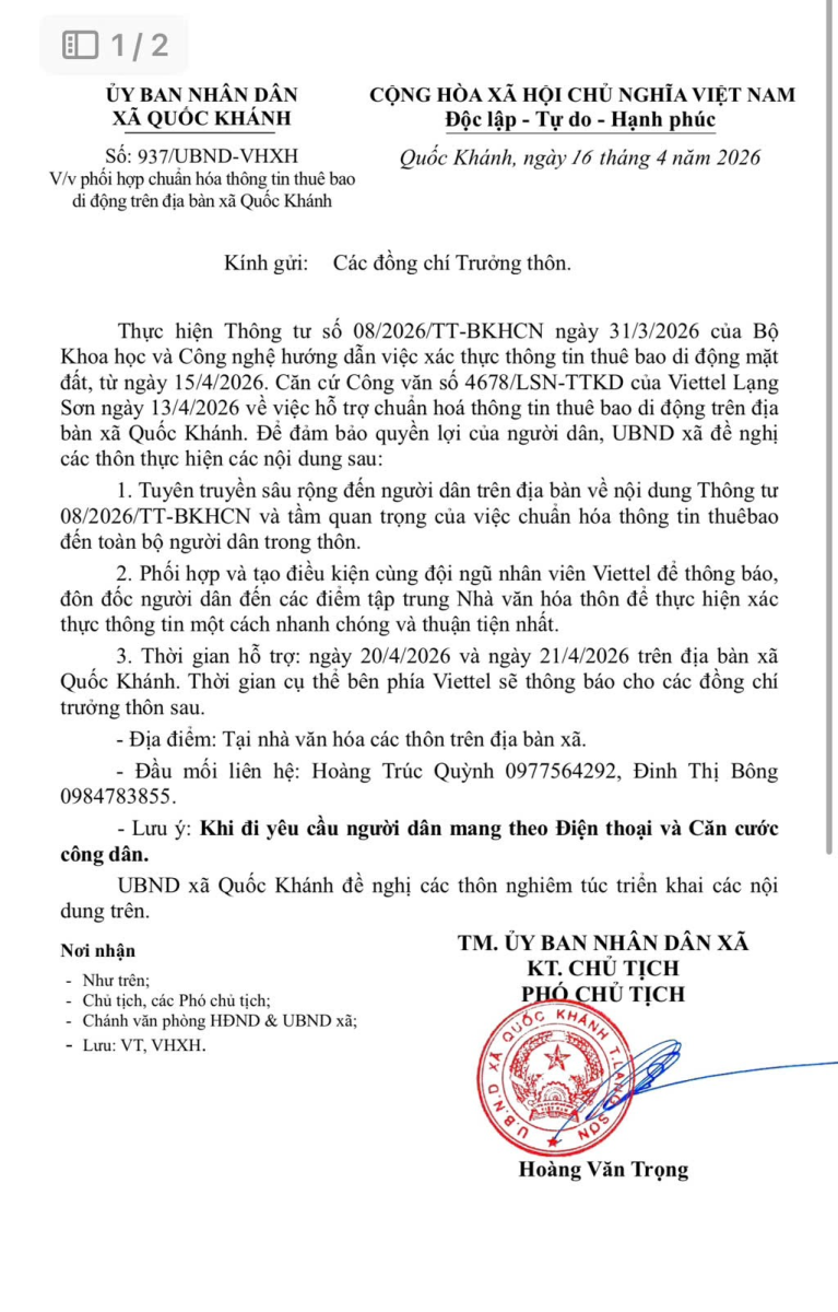 Về việc phối hợp chuẩn hóa thông tin thuê bao di động trên địa bàn xã Quốc Khánh