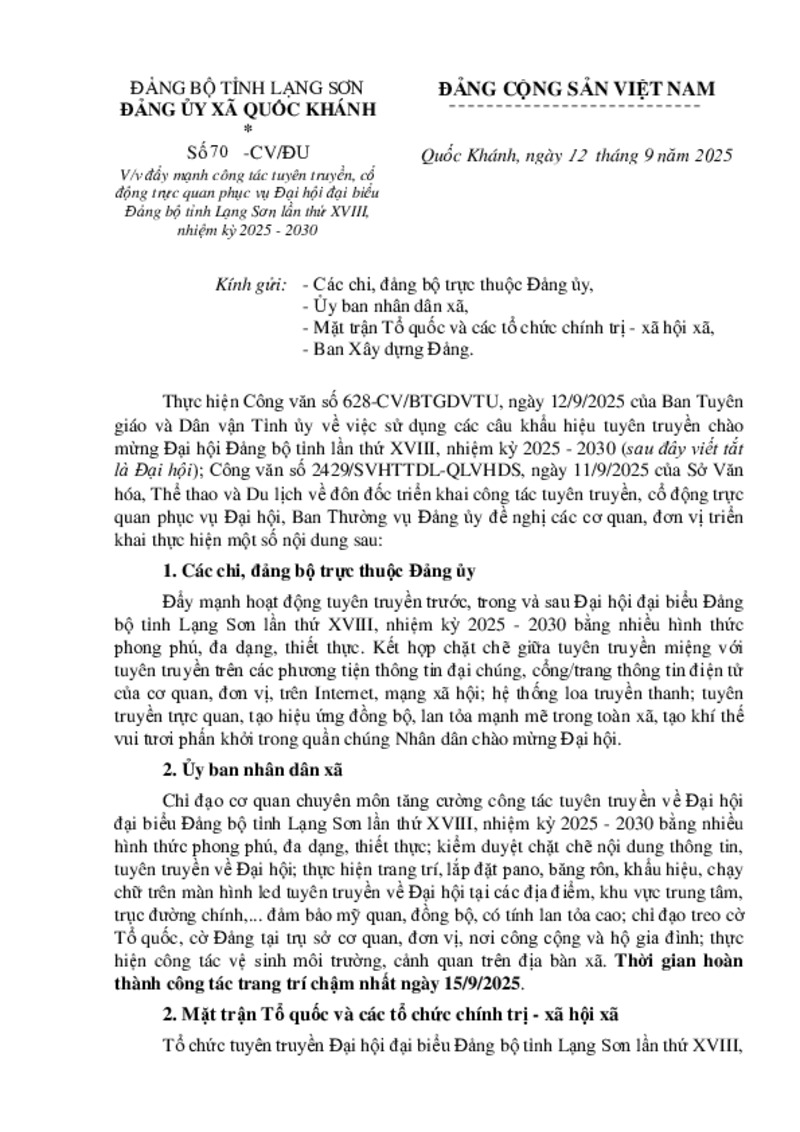| Số hiệu | 70-CV/ĐU | Cơ quan ban hành | |