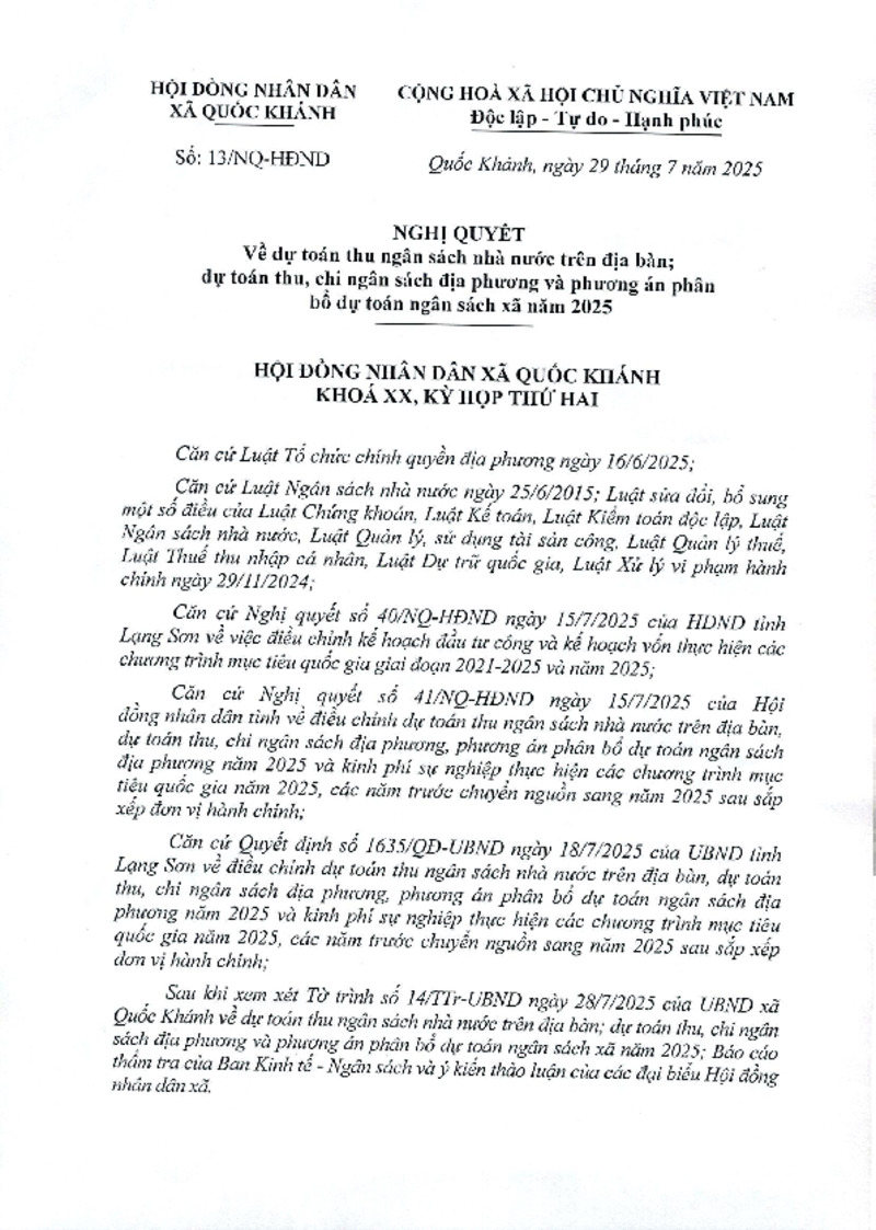 | Tiêu đề văn bản | Nghị quyết về dự toán thu ngân sách nhà nước trên địa bàn; dự toán thu, chi ngân sách địa phương và phương án phân bổ dự toán ngân sách xã năm 2025 | ||