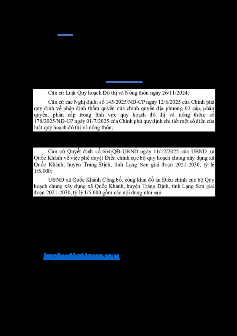 | Tiêu đề văn bản | Thông báo Công bố, công khai đồ án Điều chỉnh cục bộ Quy hoạch chung xây dựng xã Quốc Khánh, huyện Tràng Định, tỉnh Lạng Sơn giai đoạn 2021-2030, tỷ lệ 1/5.000 | ||