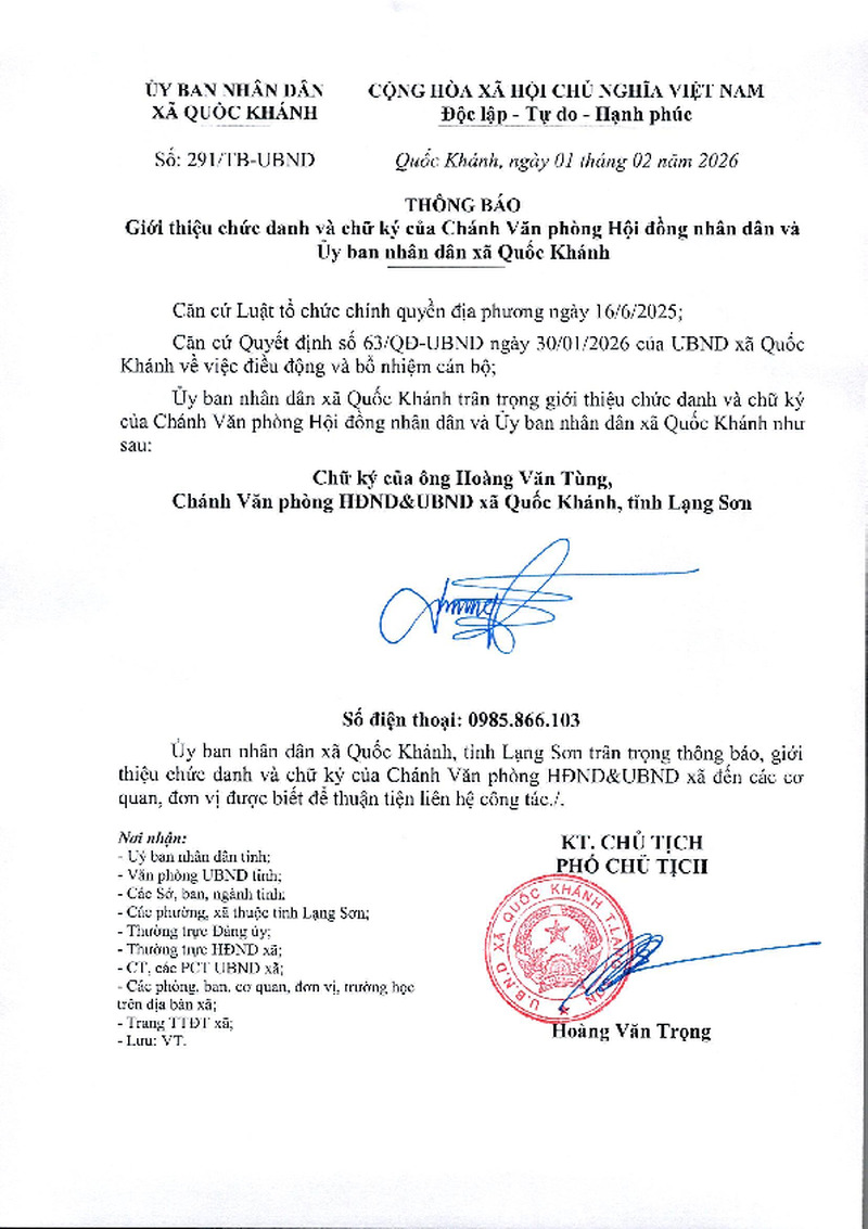 | Tiêu đề văn bản | Thông báo Giới thiệu chức danh và chữ ký của Chánh Văn phòng Hội đồng nhân dân và Ủy ban nhân dân xã Quốc Khánh | ||
